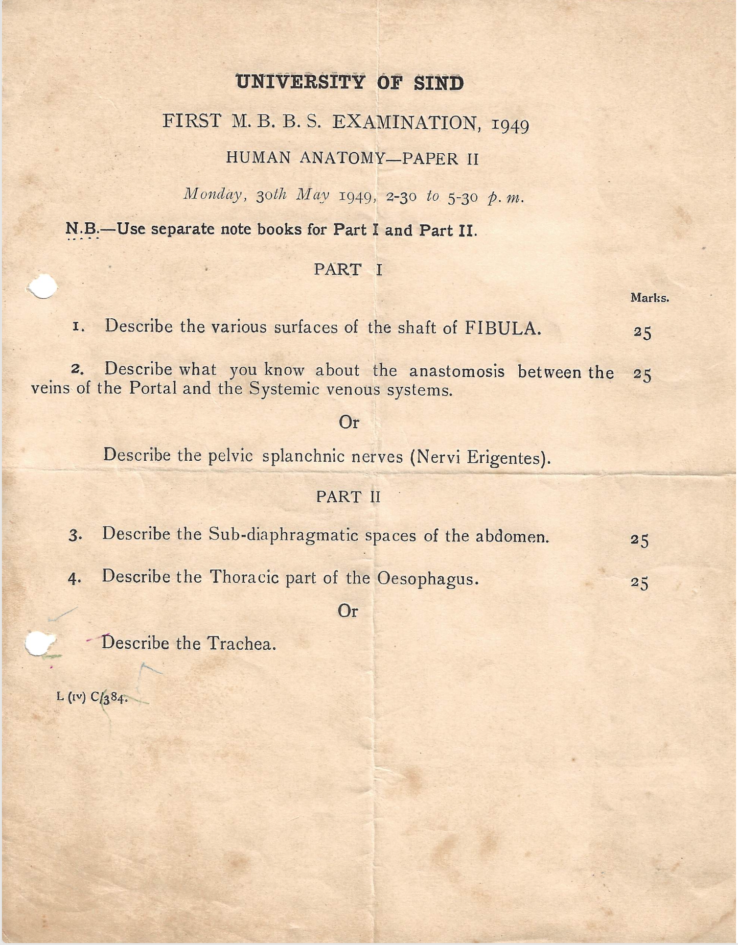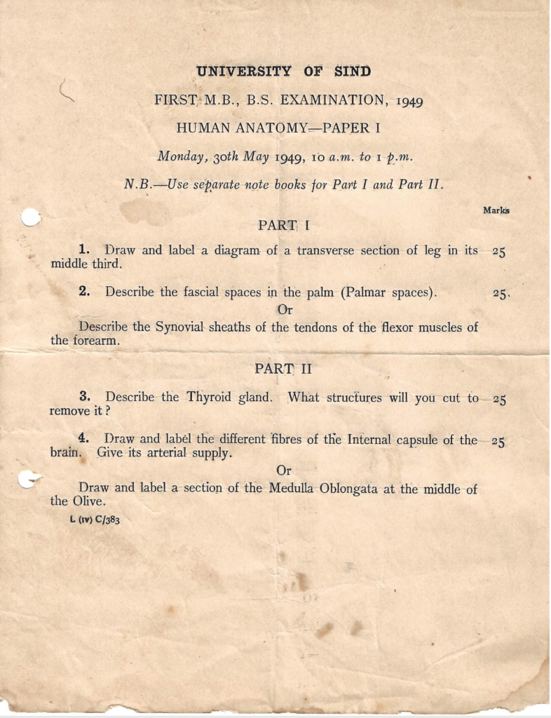 As part of the 80th Anniversary of Dow Medical College (1945–2025), TheDowDays.com is honored to present one of the most significant academic artifacts in the institutional history of our alma mater: the oldest surviving First Professional MBBS examination papers from 1949.